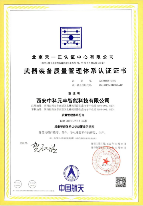 西安中科元丰智能科技有限公司与中科院山东综合技术转化中心济宁中心签署战略合作协议,具有很强的技术研发实力,2021年8月通过质量管理体系认证(证书编号:48724Q30043R1S),2022年9月通过武器装备质量管理体系认证(证书编号:02622J31576ROS),2024年12月通过高新技术企业认证(证书编号:GR202461000424),在复材方面获得发明专利1项,并于2024年10月获得陕西省振动工程学会科学技术奖二等奖1项。公司2020年成立,2022年6月整体入住西安佑鑫电子产业园,现拥有包括模温机、模压机、五轴加工中心等多种设备,具有非金属、金属产品的设计、制造能力。